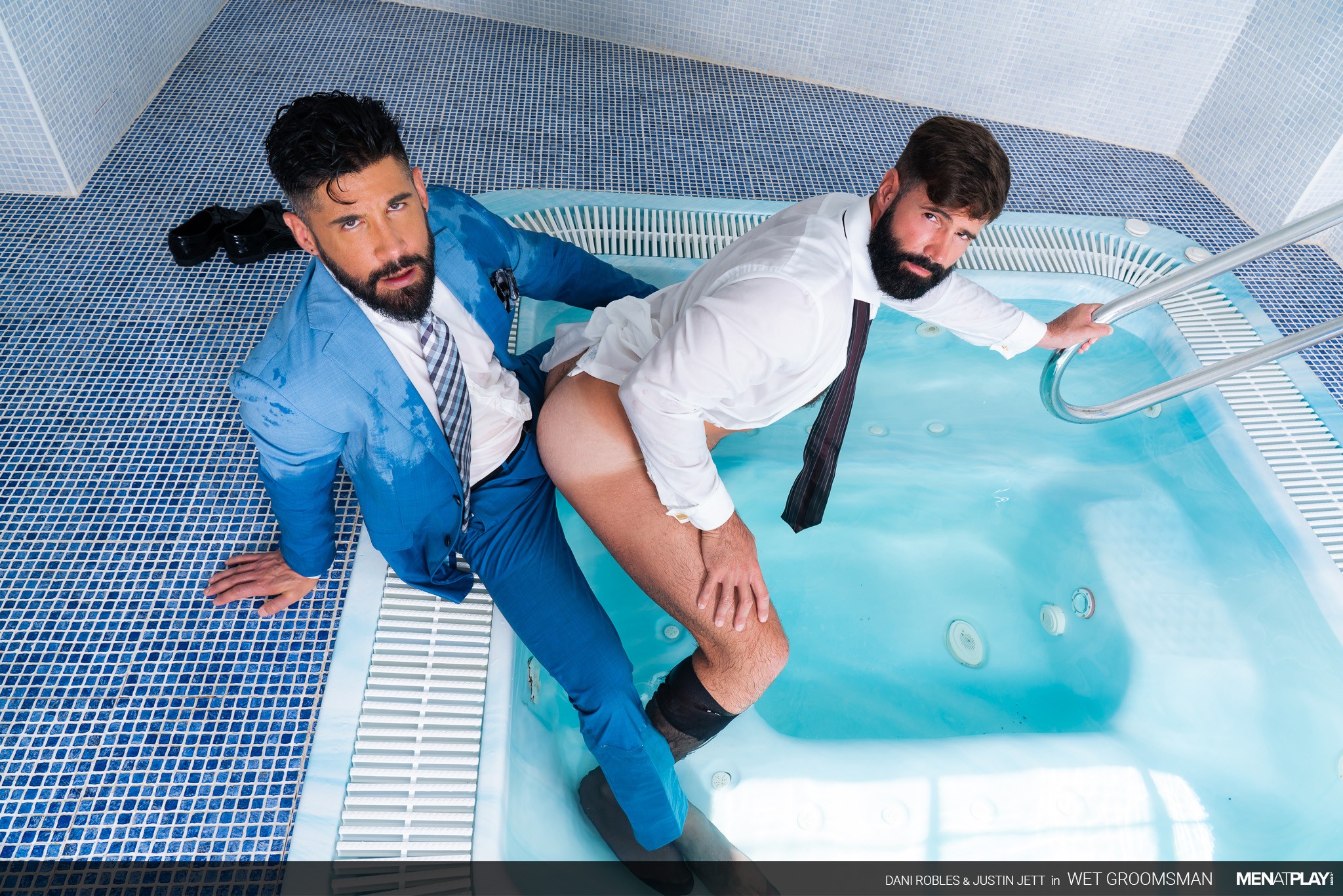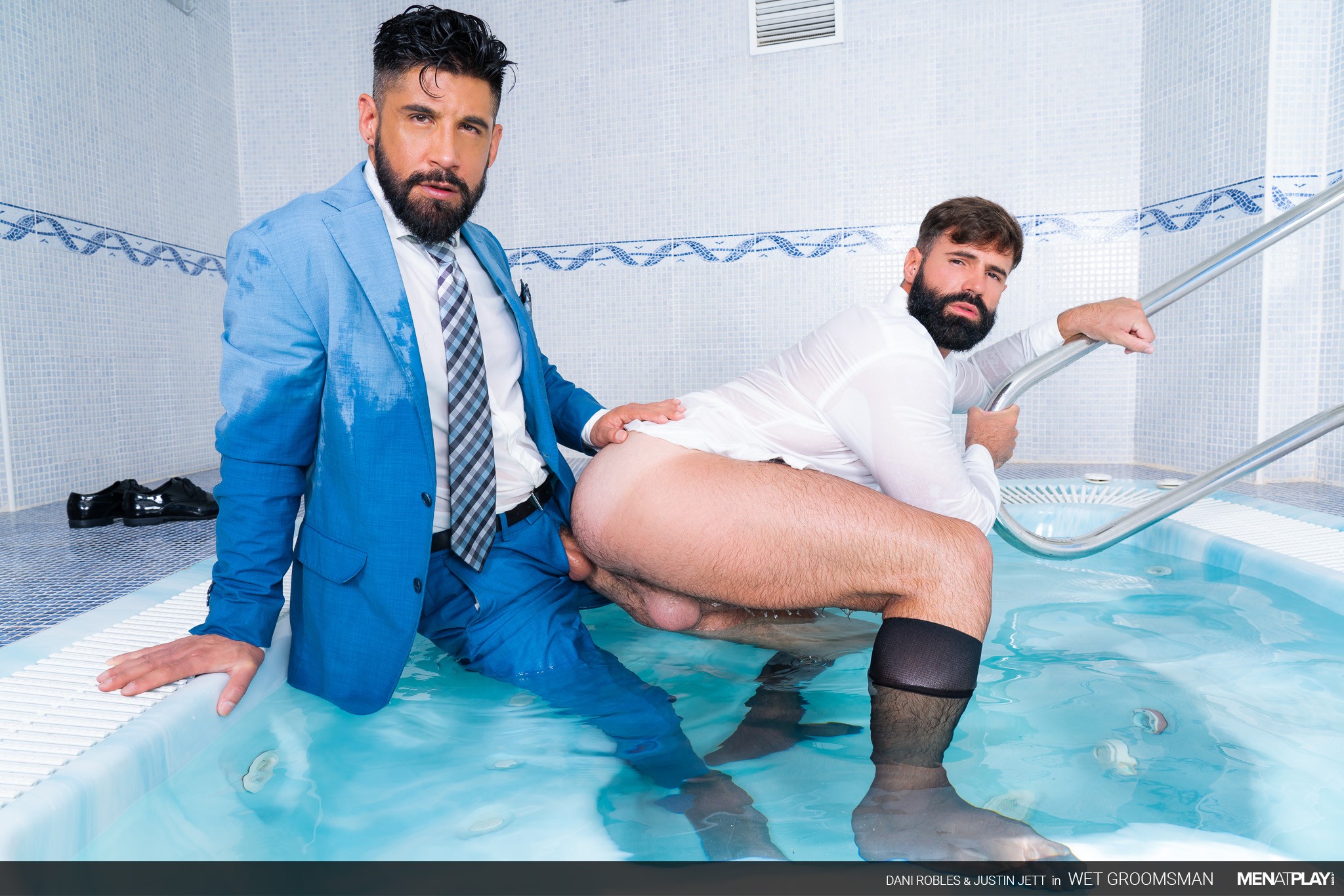 Clothed men fucking in a hottub